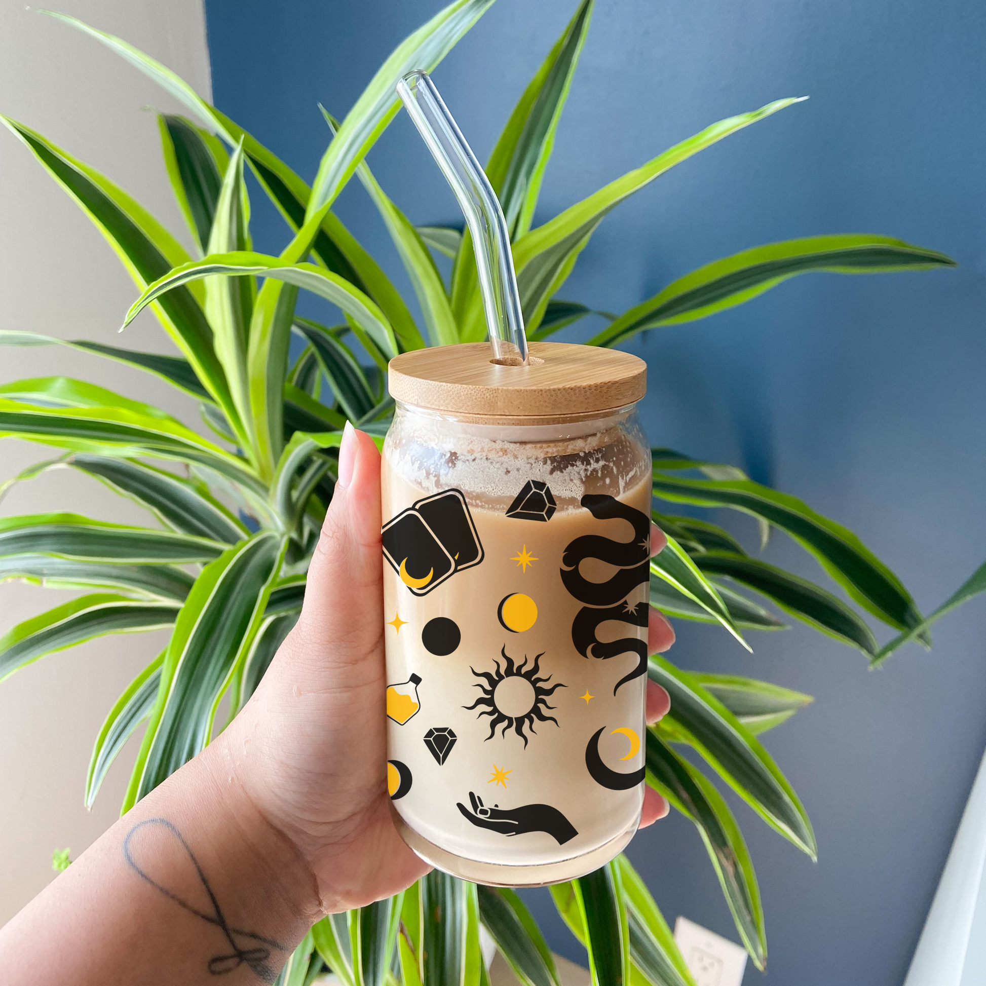 Gorgeous esoteric pattern mug. Perfect witchy cup for you or as a gift! With that same perfect hand-holding, lip-hugging shape as a soda or beer can, this aesthetic cup is sure to please! Pairs really well with a bamboo lid and glass straw.