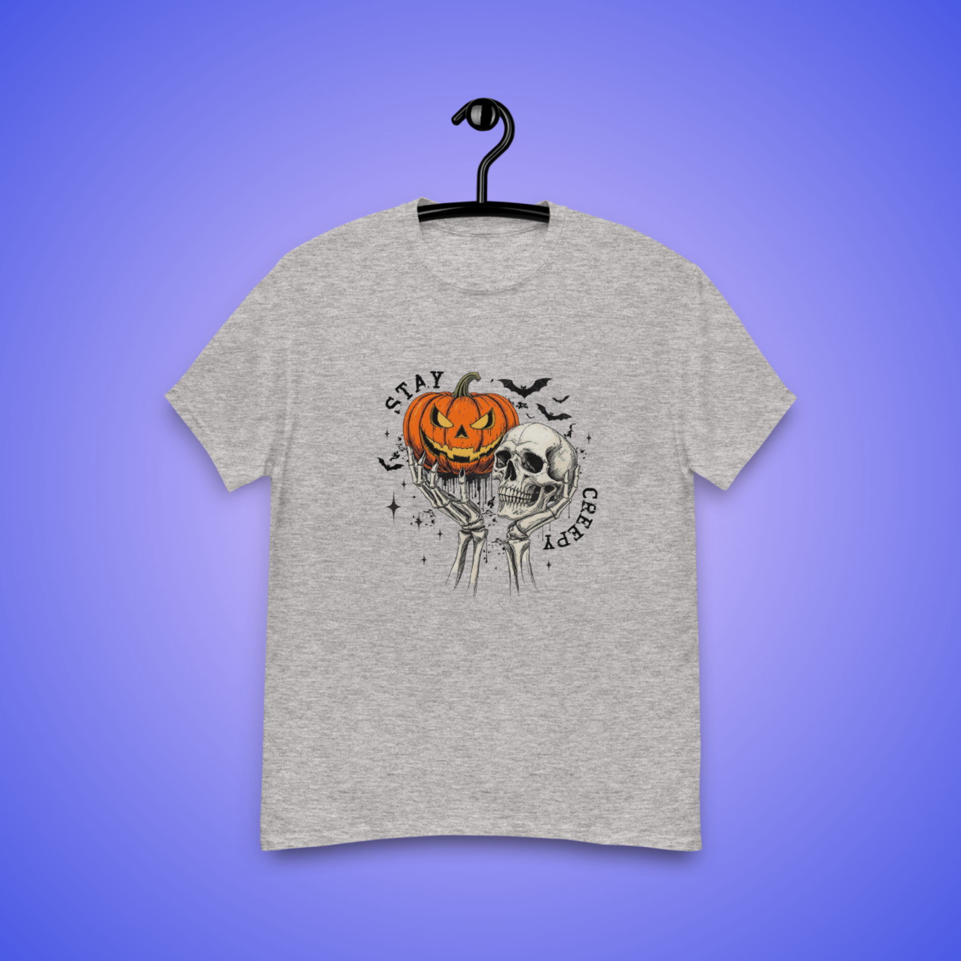 Embrace spooky season in style with this Stay Creepy graphic Halloween t-shirt. Featuring a bold vintage-inspired design of a grinning jack-o’-lantern and skull held by skeleton hands, surrounded by bats and eerie stars, this cozy tee is perfect for anyone who loves all things creepy-cute.