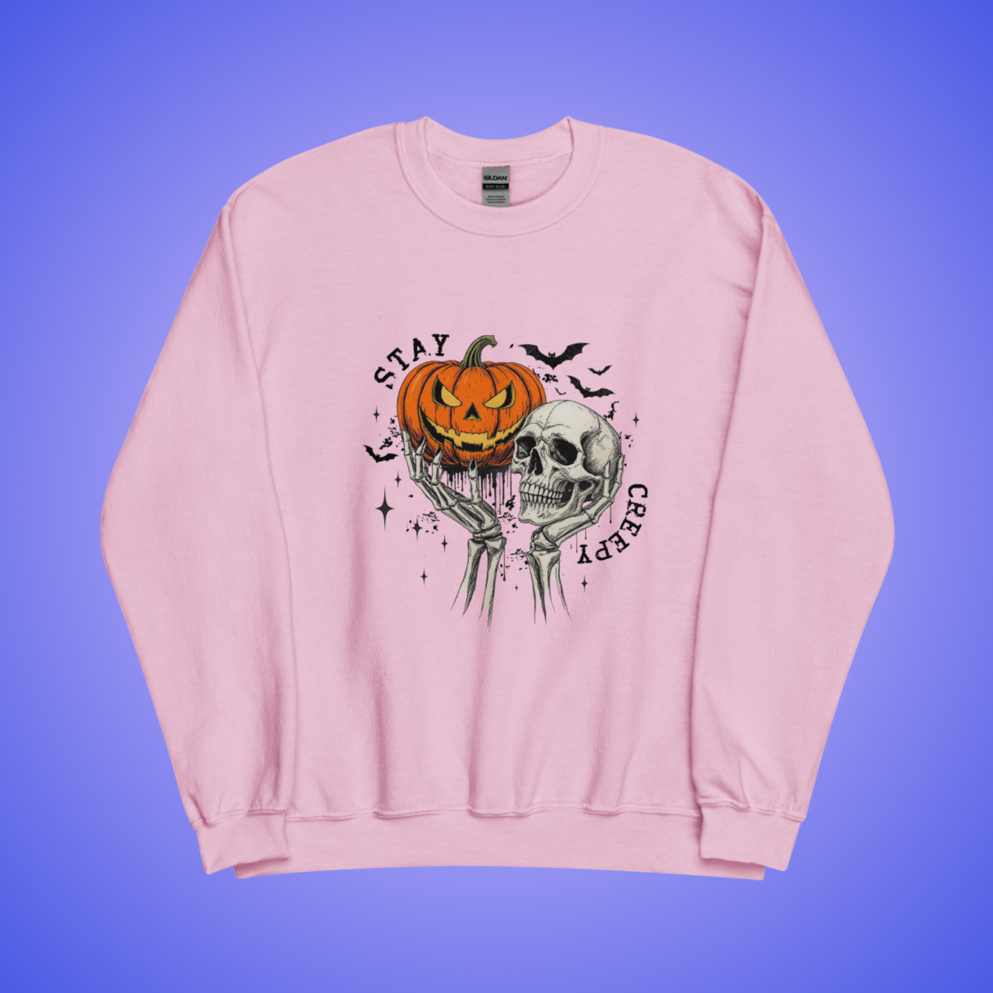 Embrace spooky season in style with this Stay Creepy graphic Halloween sweatshirt. Featuring a bold vintage-inspired design of a grinning jack-o’-lantern and skull held by skeleton hands, surrounded by bats and eerie stars, this cozy sweatshirt is perfect for anyone who loves all things creepy-cute.